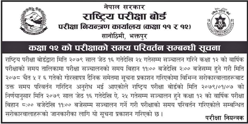 राष्ट्रिय बोर्ड परीक्षा नियन्त्रण कार्यालयले विभिन्न सरोकारवालाहरुको आग्रहमा दिउँसो ११ बजेदेखि २ बजेसम्म हुने भनिएको परीक्षाको समय बिहानमा परीक्षा गर्ने भएको हो ।